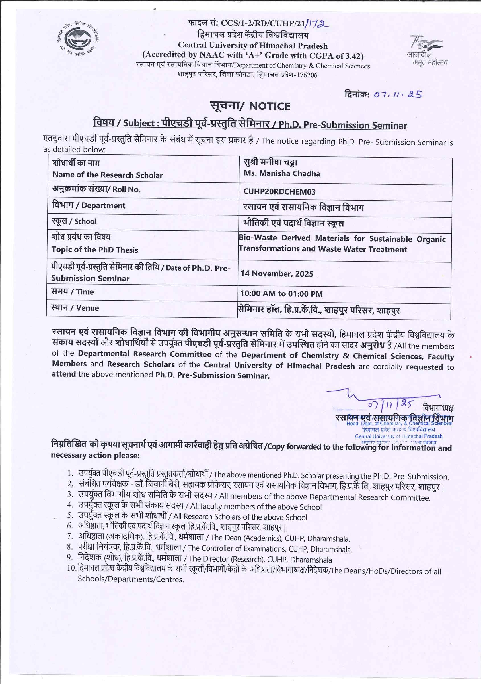 Pre-submission of Ms. Manisha Chadha (CUHP20RDCHEM03), Department of Chemistry & Chemical Sciences