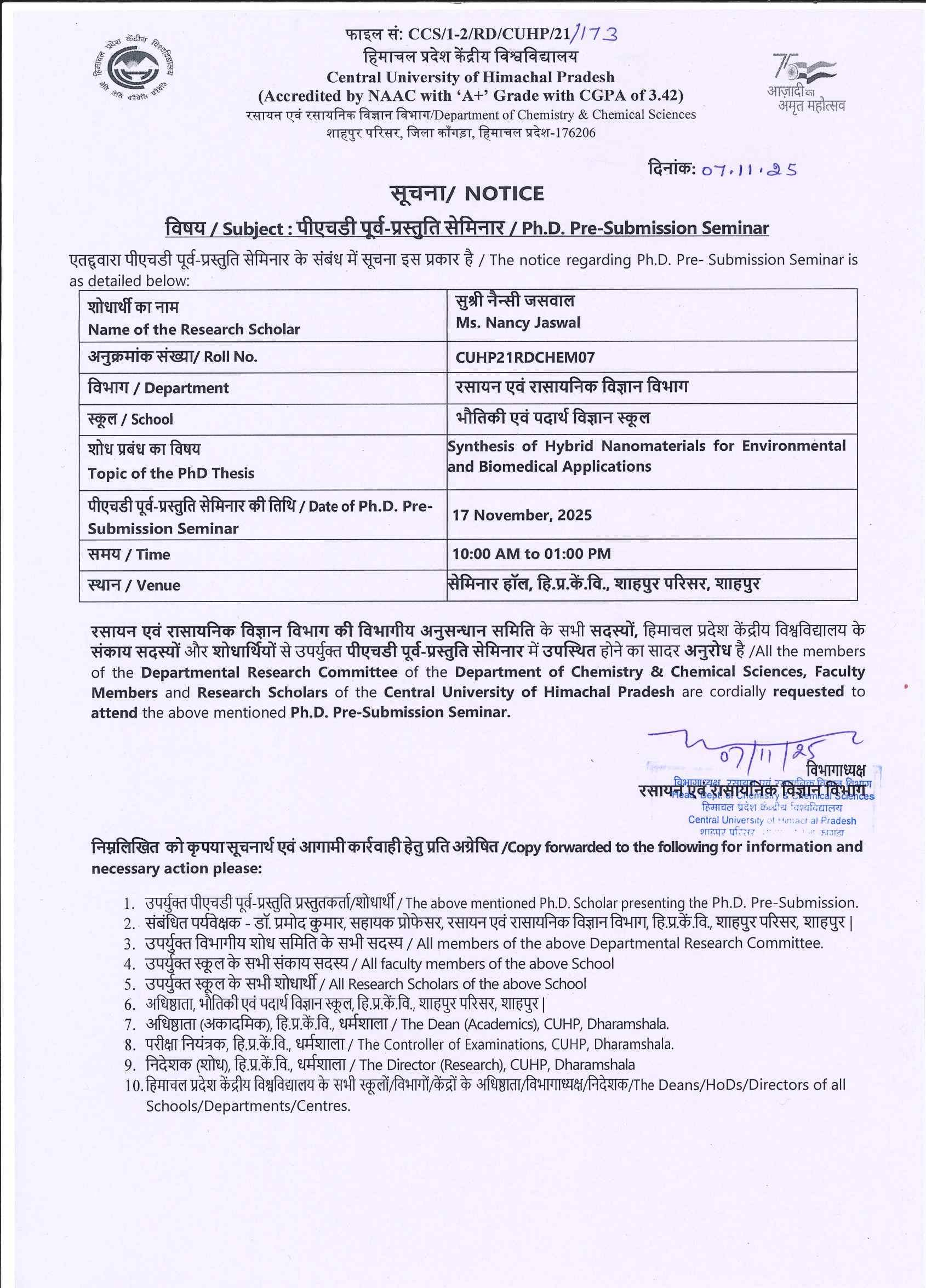 Pre-submission of Ms. Nancy Jaswal (CUHP21RDCHEM07), Department of Chemistry & Chemical Sciences