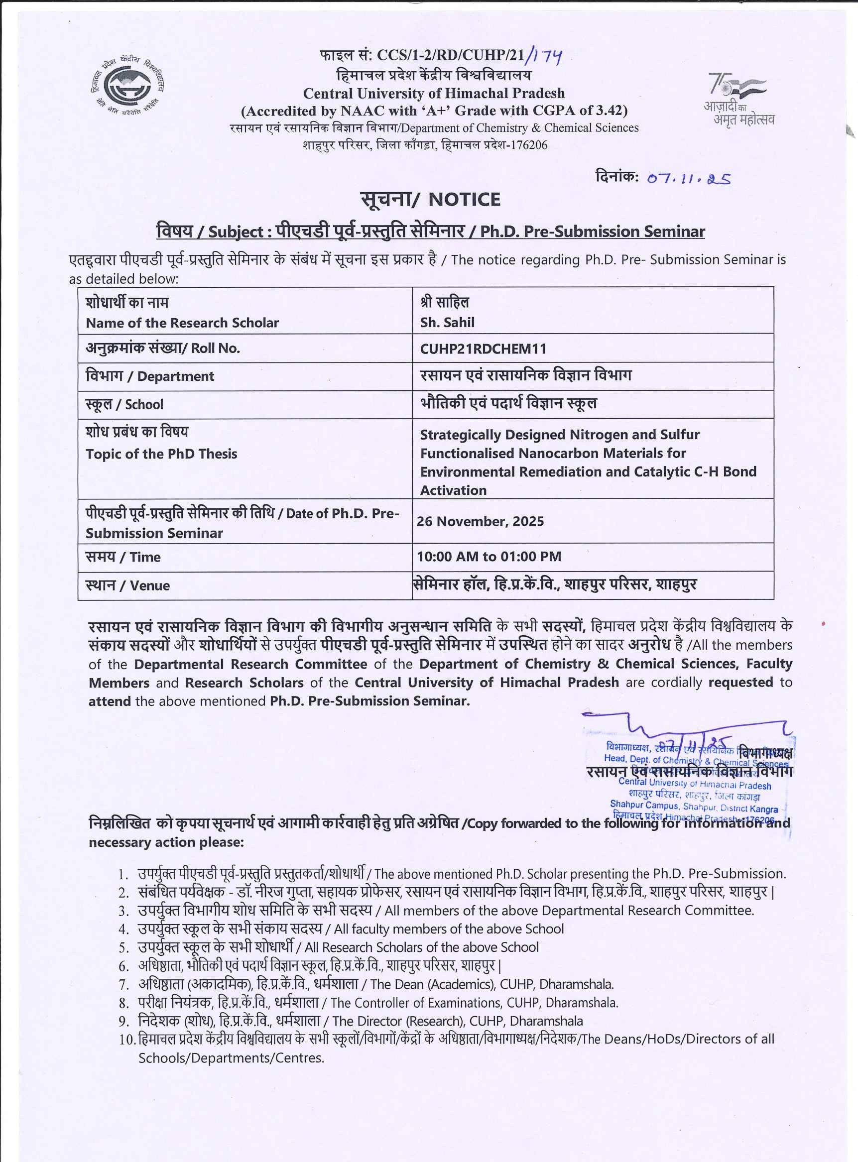 Pre-submission of Mr. Sahil (CUHP21RDCHEM11), Department of Chemistry & Chemical Sciences