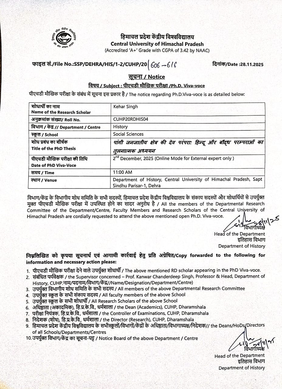 Ph.D. Viva Voce Examination of Mr. Kehar Singh (CUHP20RDHIS04), Department of History