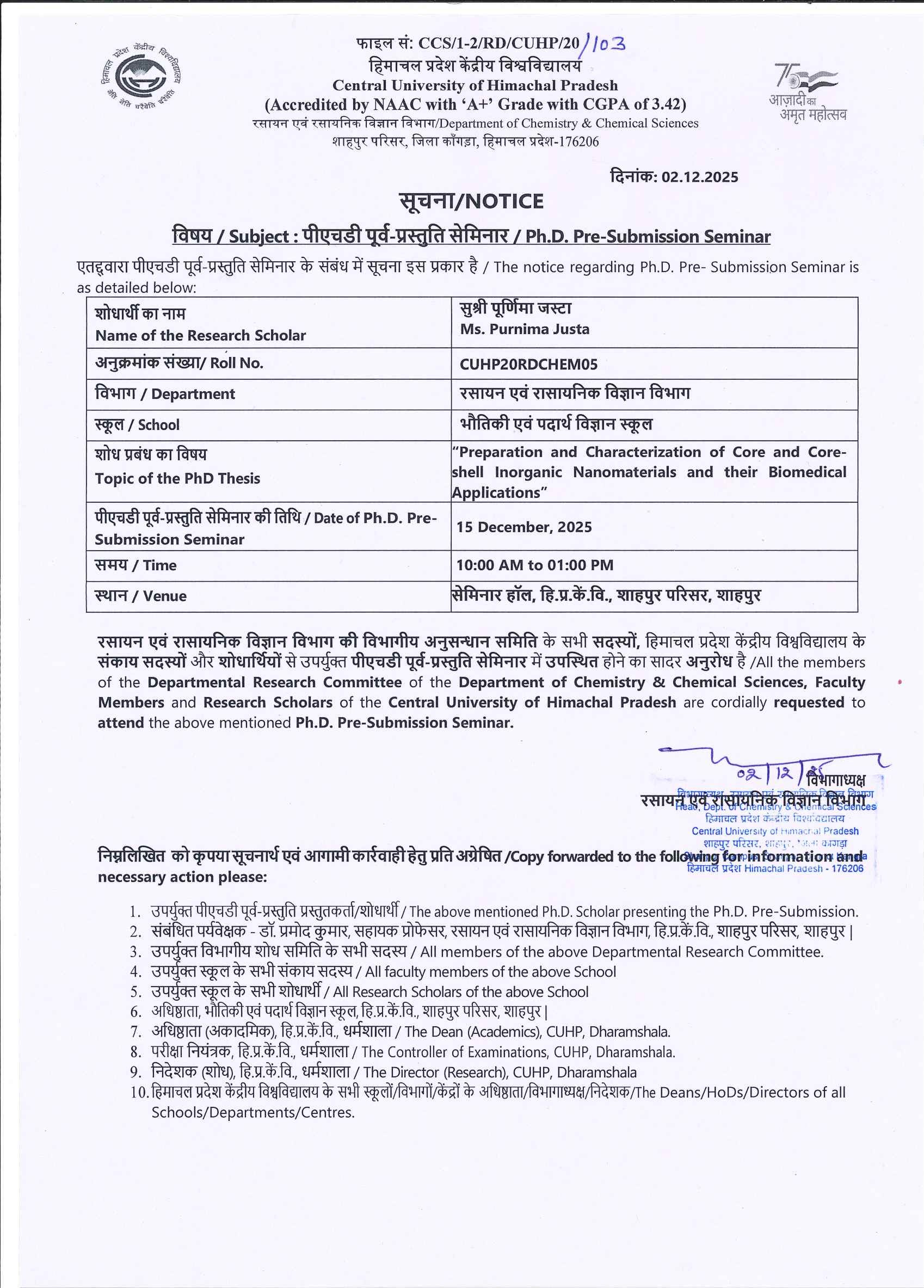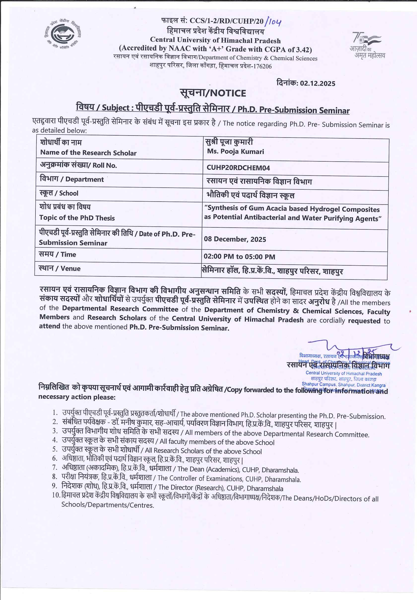 Pre-submission of Ms. Pooja Kumari (CUHP20RDCHEM04), Department of Chemistry & Chemical Sciences
